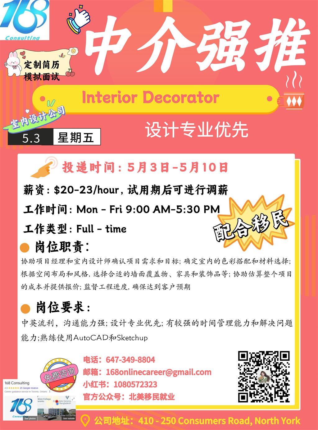 【168新岗】北约克室内设计公司请Interior Decorator 1名(可移民)