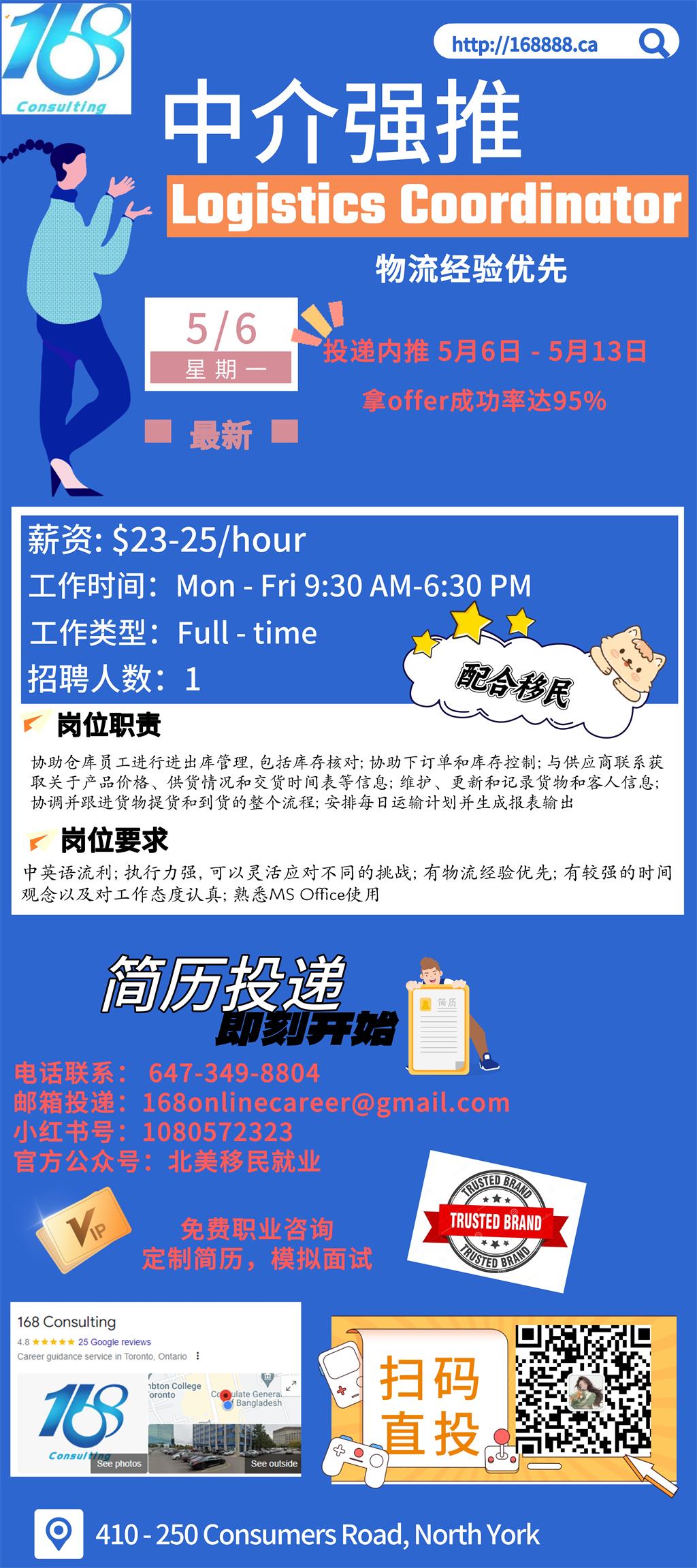【168新岗】万锦物流公司请Logistics Coordinator 1名 (可移民)