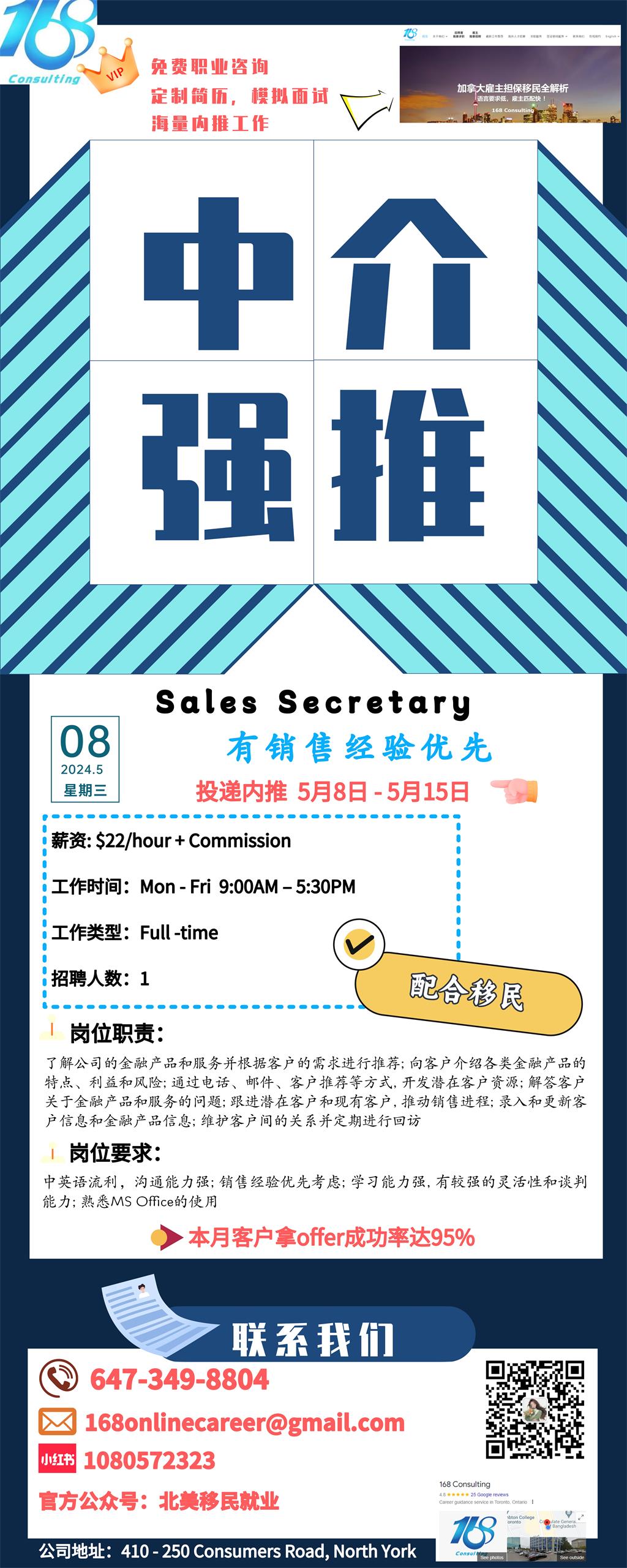 【168新岗】多伦多金融公司请Sales Secretary 1名(可移民)