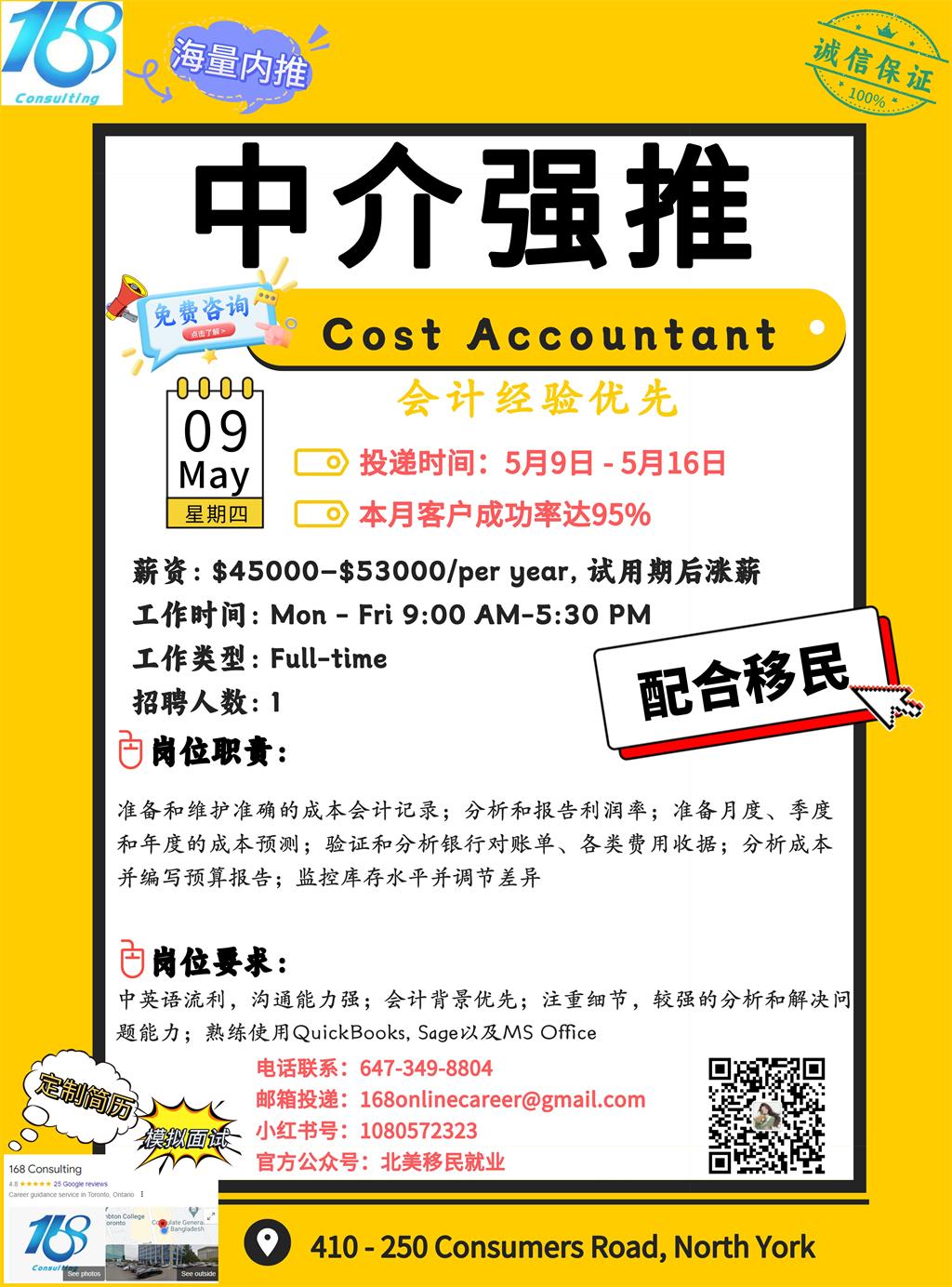 【168新岗】万锦服装贸易公司招聘Cost Accountant 1名(可移民)