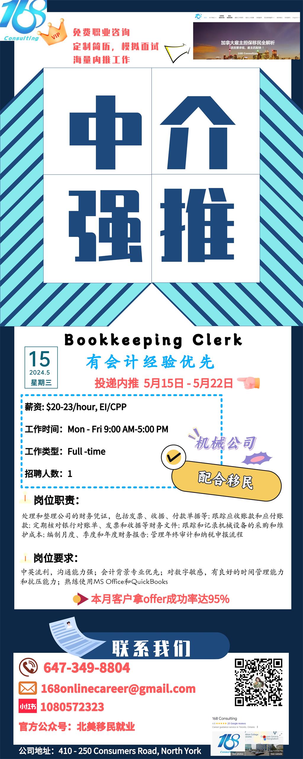 【168新岗】士嘉堡机械公司招聘Bookkeeping Clerk 1名(可移民)