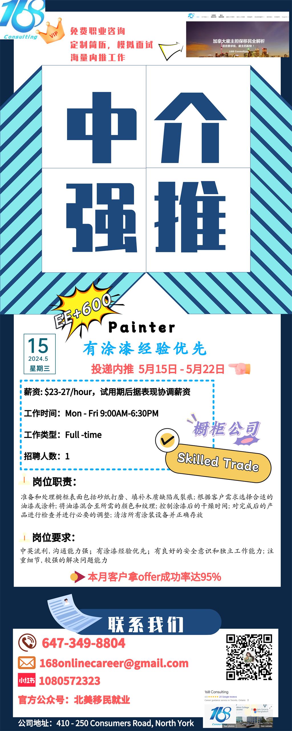 【168新岗】北约克橱柜公司招Painter 1名 (skilled trade +可移民)