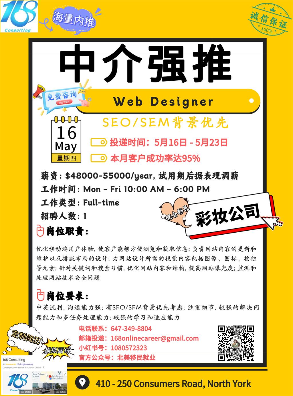 【168新岗】密西彩妆公司招聘Web Designer 1名(可移民)