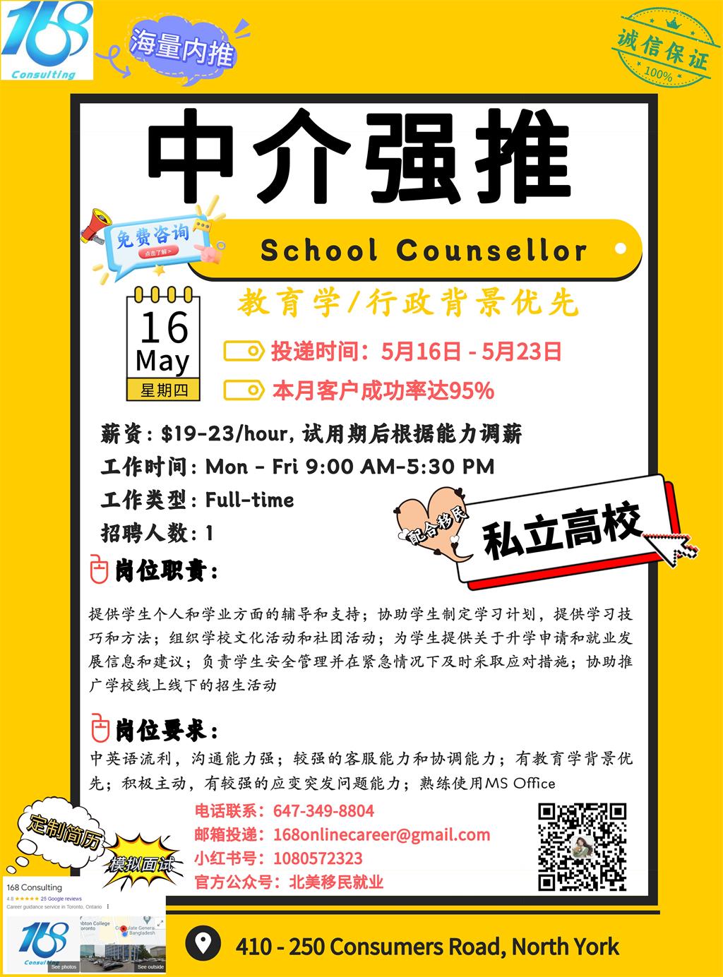 【168新岗】万锦私立高校招聘School counsellor 1名(可移民)