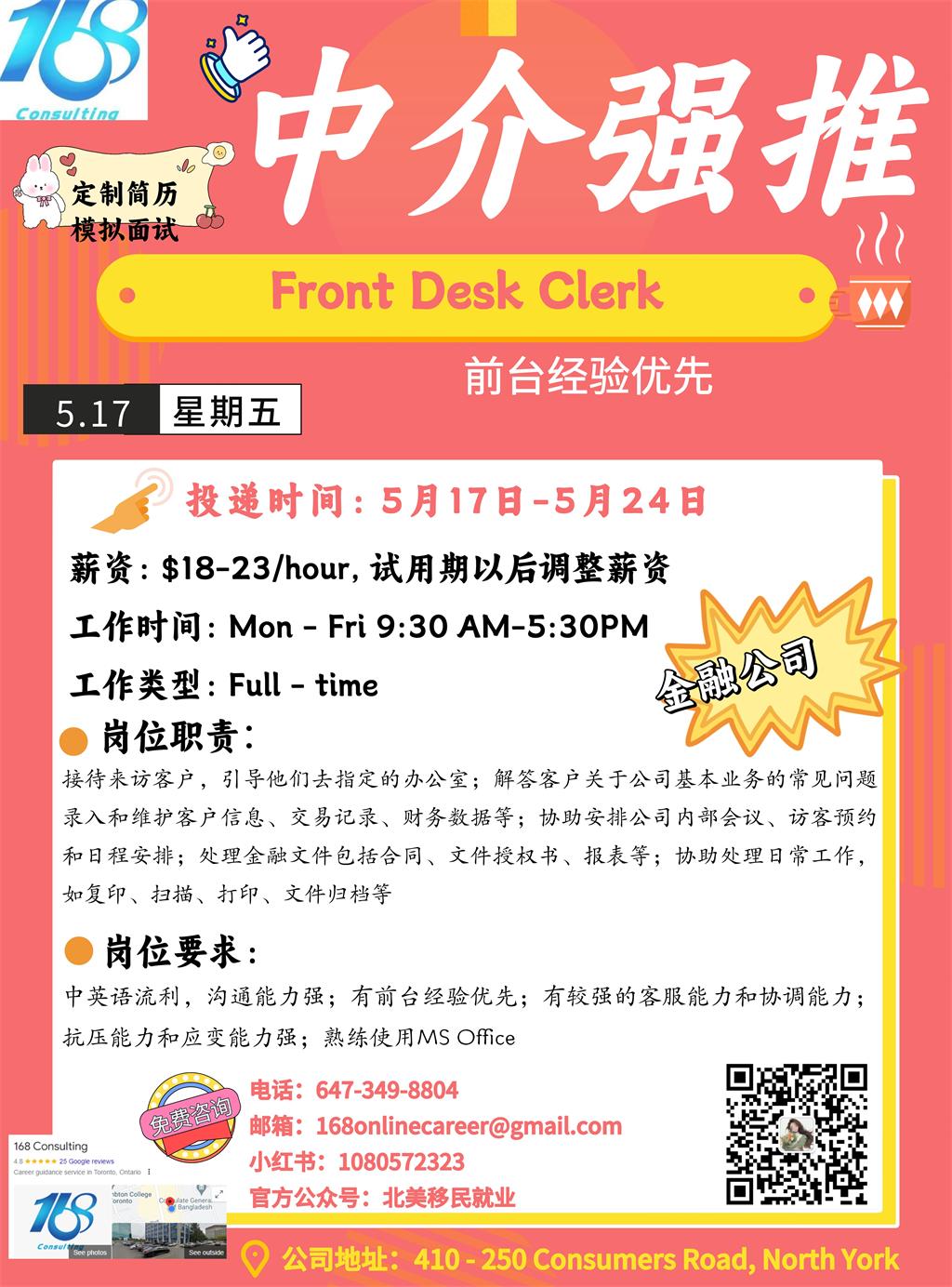 【168新岗】密西金融公司招聘Front Desk Clerk 1名
