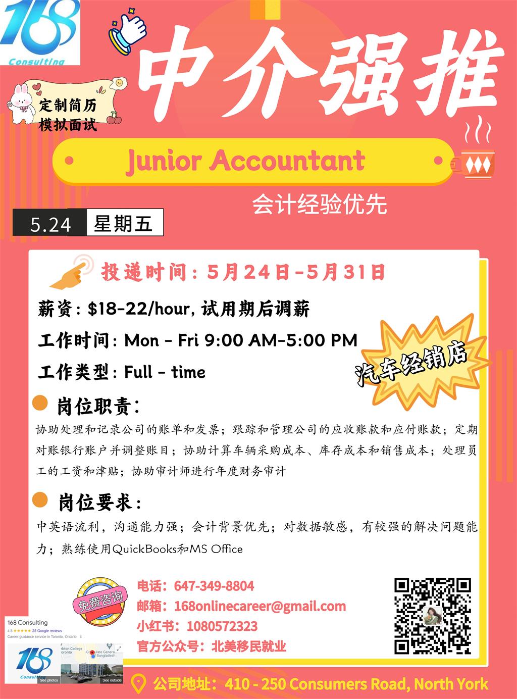 【168新岗】士嘉堡汽车经销店招聘Junior Accountant 1名
