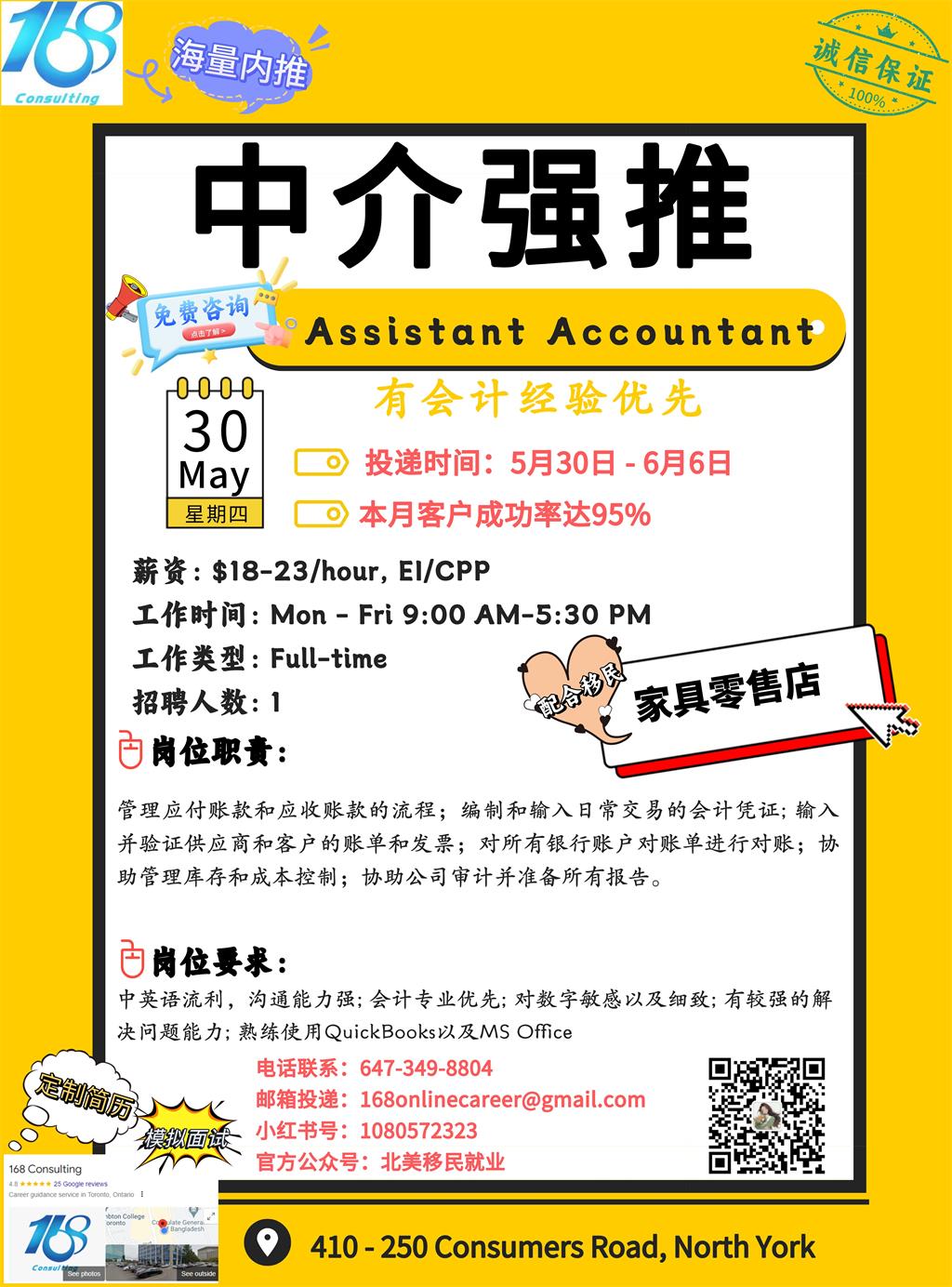 【168新岗】密西家具零售店招聘Assistant Accountant 1名(可移民)