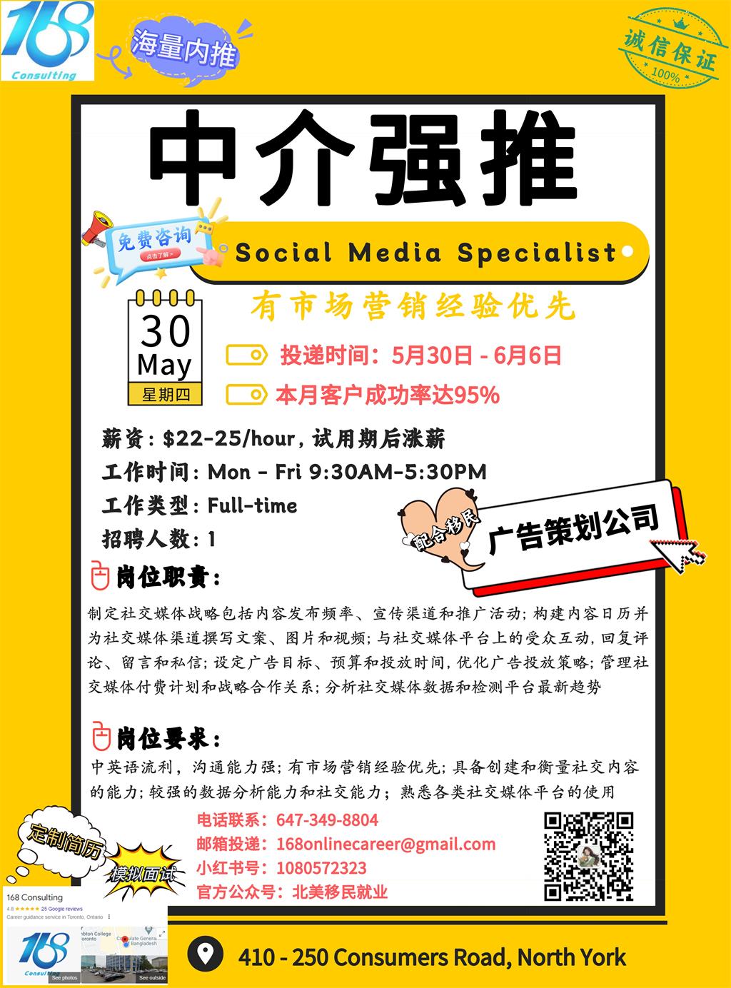【168新岗】多伦多广告策划公司招聘Social Media Specialist 1名(可移民)