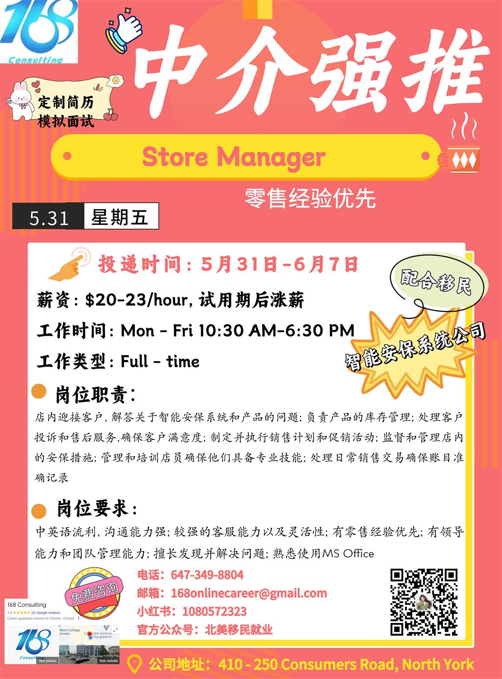 【168新岗】万锦智能安保系统公司招聘Store Manager 1名(可移民)