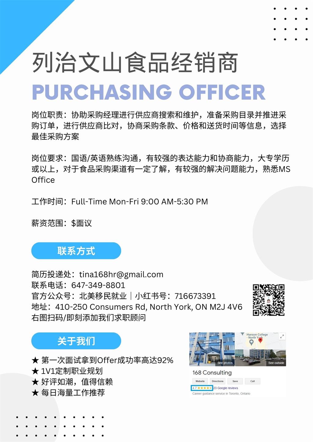 首页 > 招聘求职 > 【168移民工作内推】列治文山食品经销商请Purchasing Officer 1名