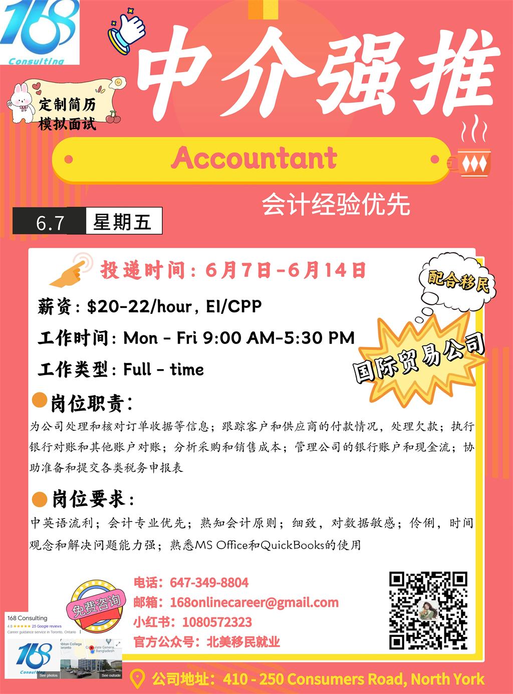 【168新岗】列治文山国际贸易公司招聘Accountant 1名(可移民)
