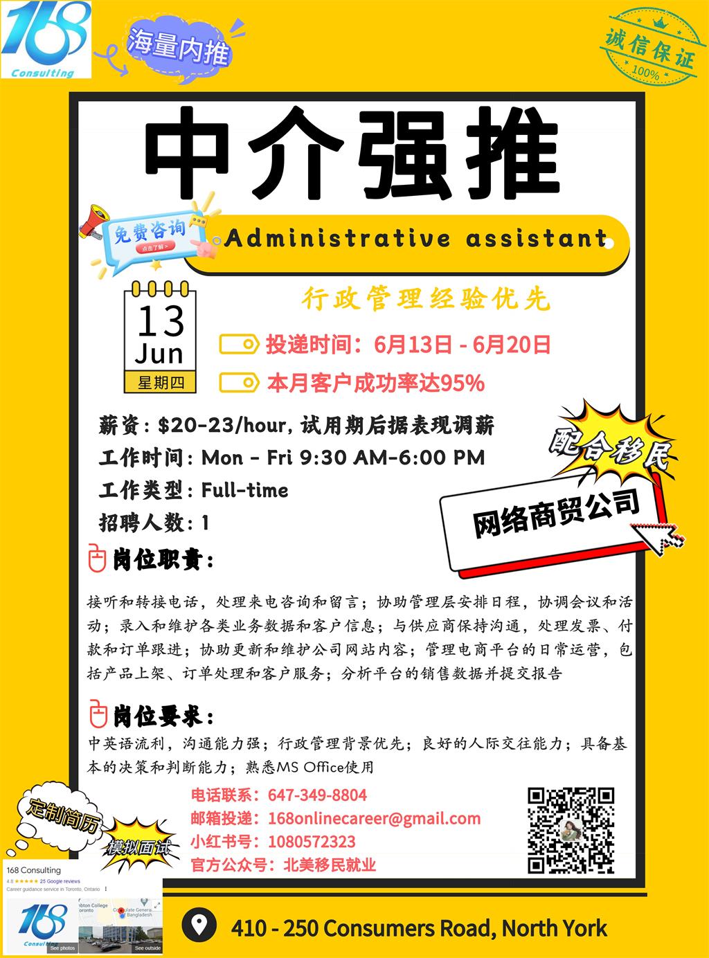 【168新岗】万锦网络商贸公司招聘Administrative assistant 1名 (可移民)