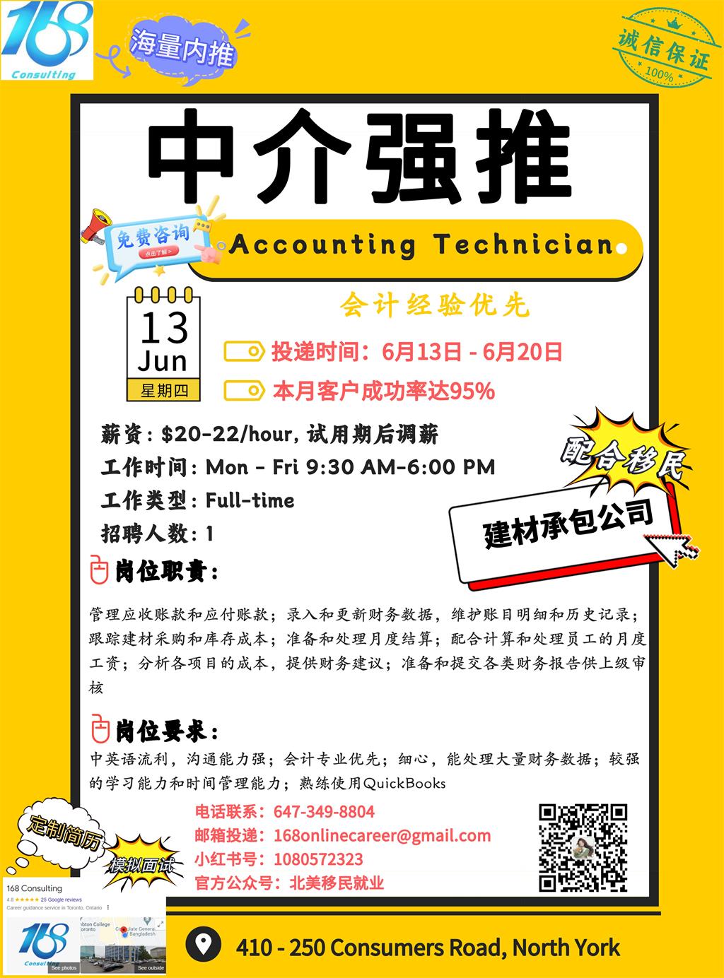【168新岗】士嘉堡建材承包公司招聘Accounting Technician 1名(可移民)