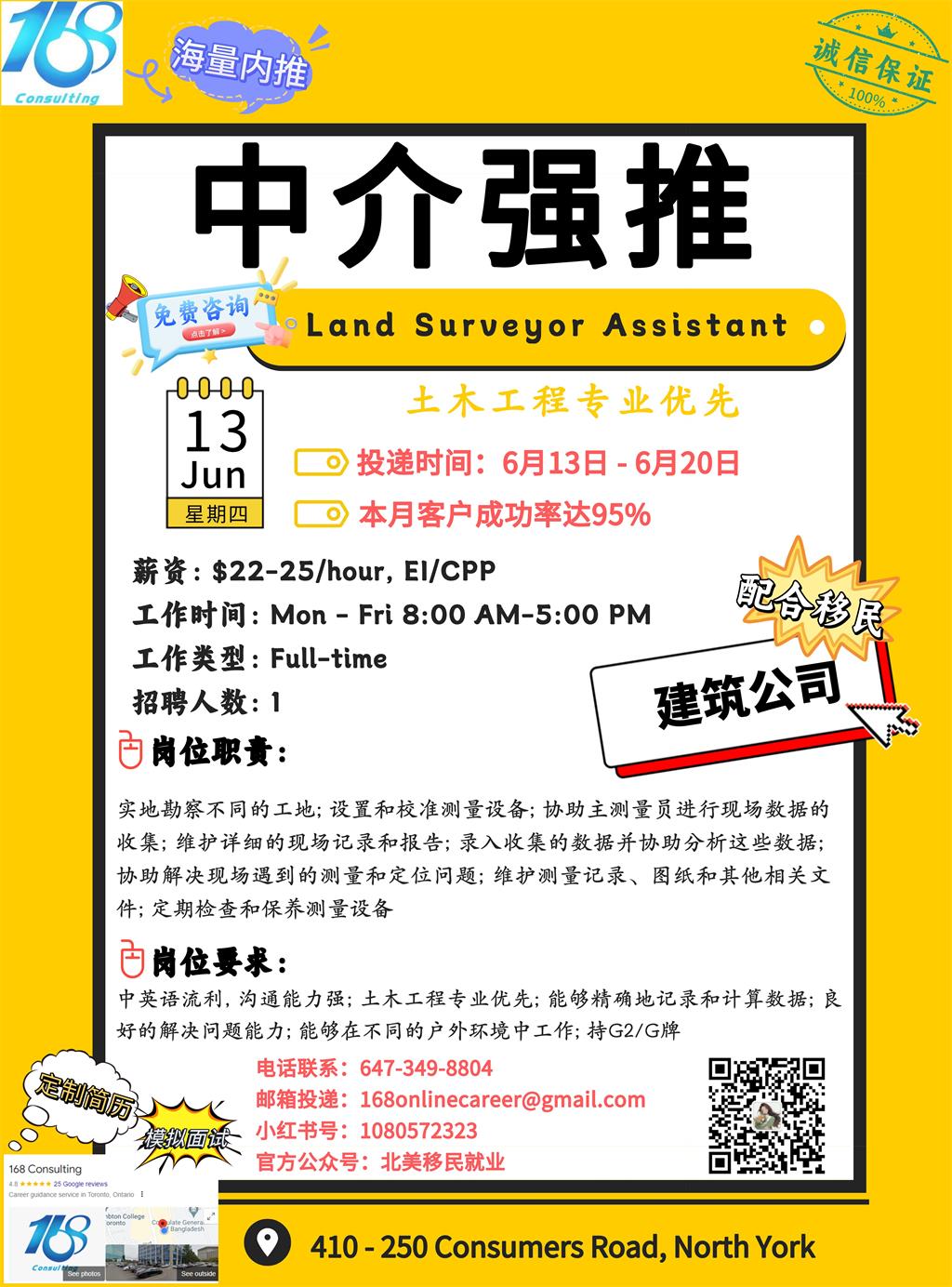 【168新岗】多伦多建筑公司招Land Surveyor Assistant 1名(可移民)