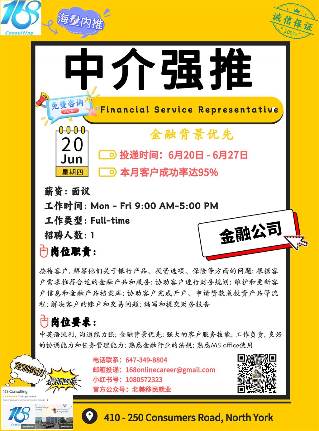 【168新岗】北约克金融公司招聘Financial Service Representative 1名