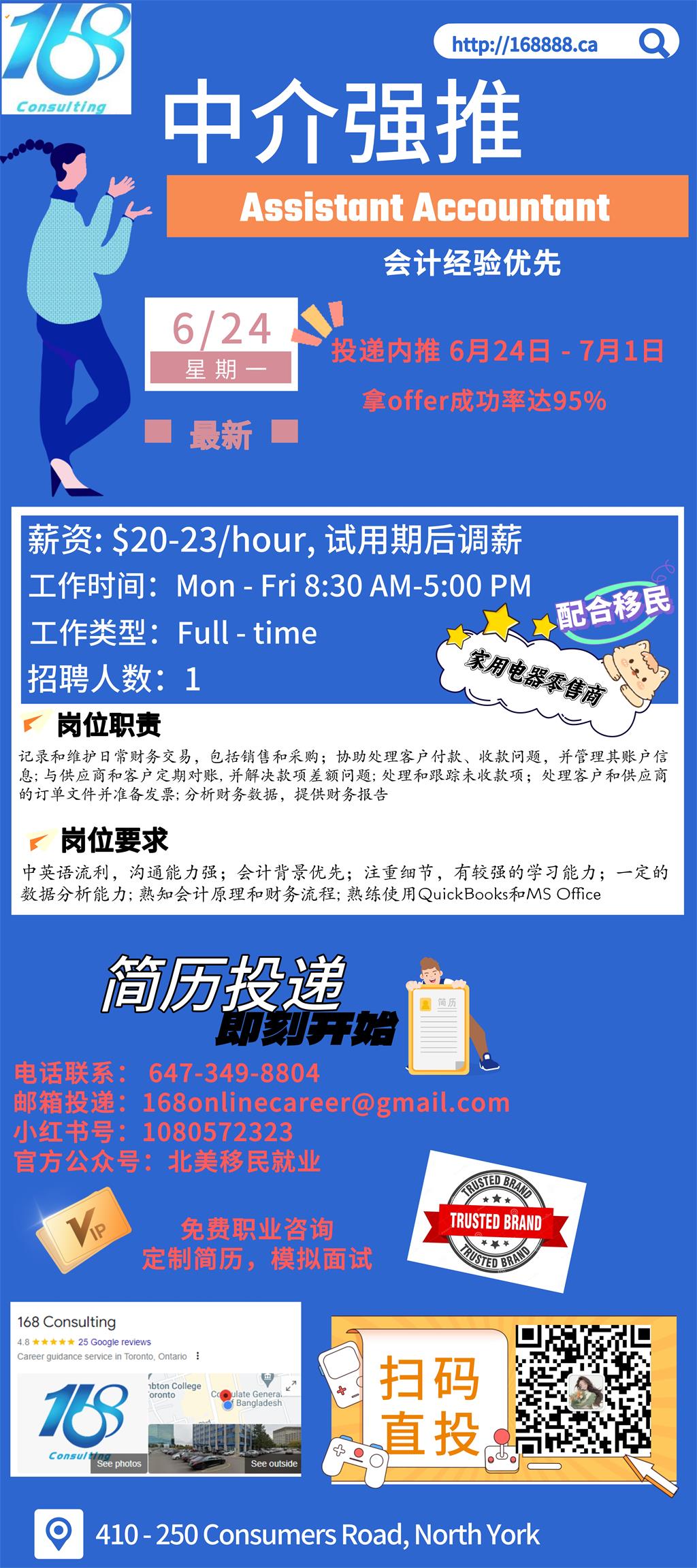 【168新岗】士嘉堡家用电器零售商招聘Assistant Accountant 1名(可移民)