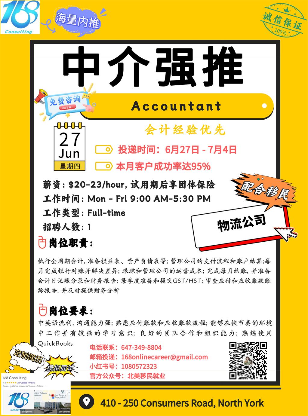 【168新岗】北约克物流公司招聘Accountant 1名(可移民)