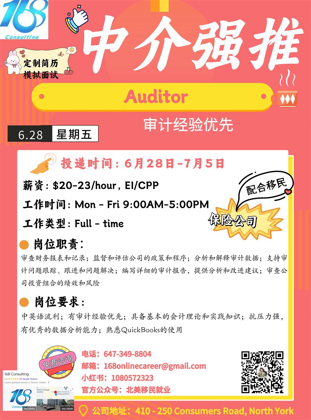 【168新岗】万锦保险公司招聘Auditor 1名(可移民)
