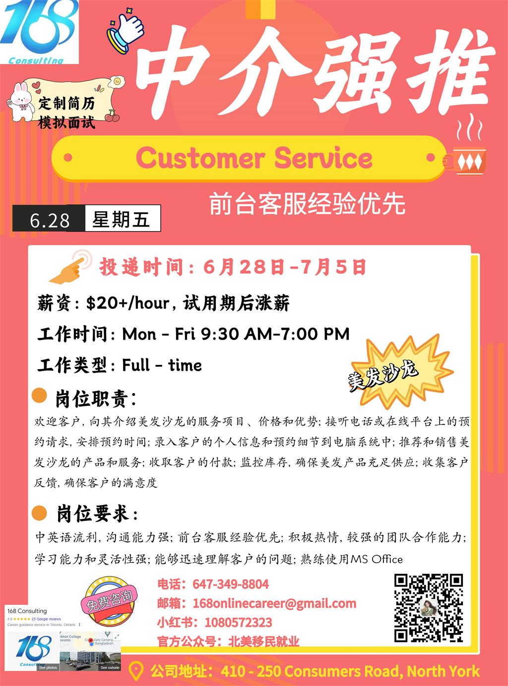 首页 > 招聘求职 > 【168新岗】士嘉堡美发沙龙招聘Customer Service 1名