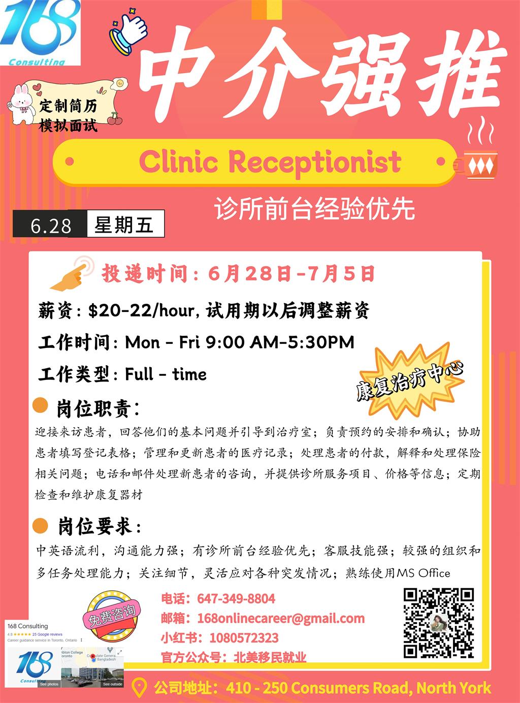 【168新岗】密西康复治疗中心招聘Clinic Receptionist 1名