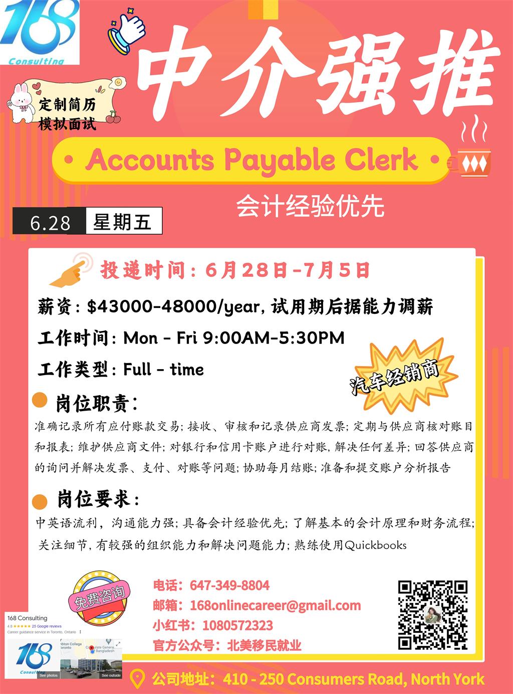 【168新岗】Downtown汽车经销商招聘Accounts payable clerk 1名