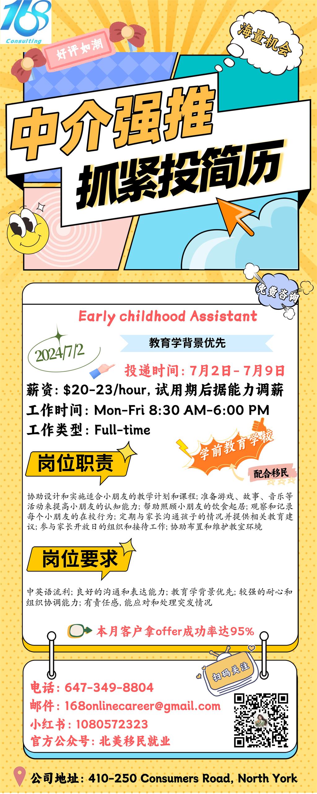 【168新岗】列治文山学前教育学校招聘Early Childhood Assistant 1名(可移民)