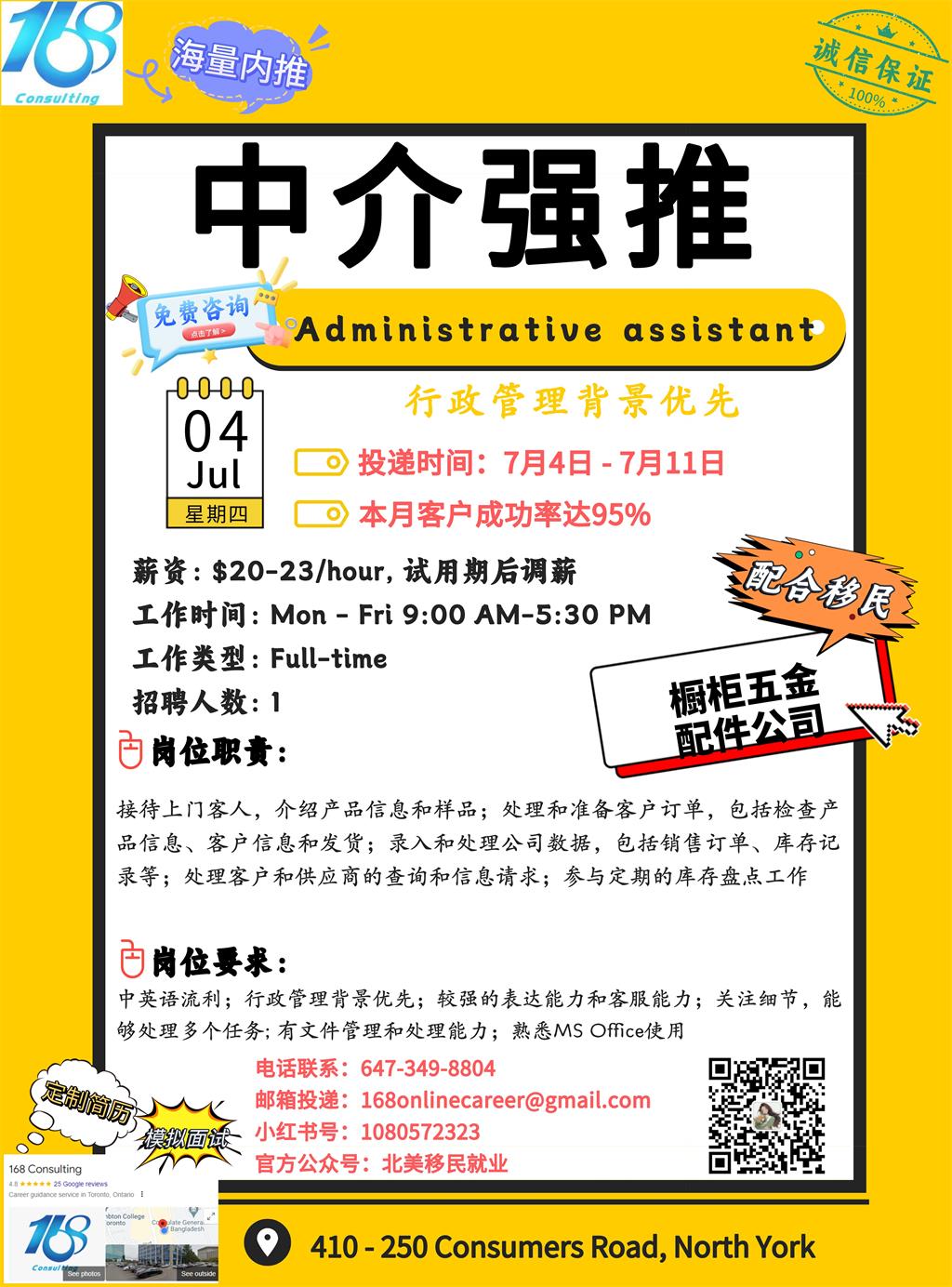 【168新岗】密西橱柜五金配件公司招聘Administrative assistant 1名 (可移民)
