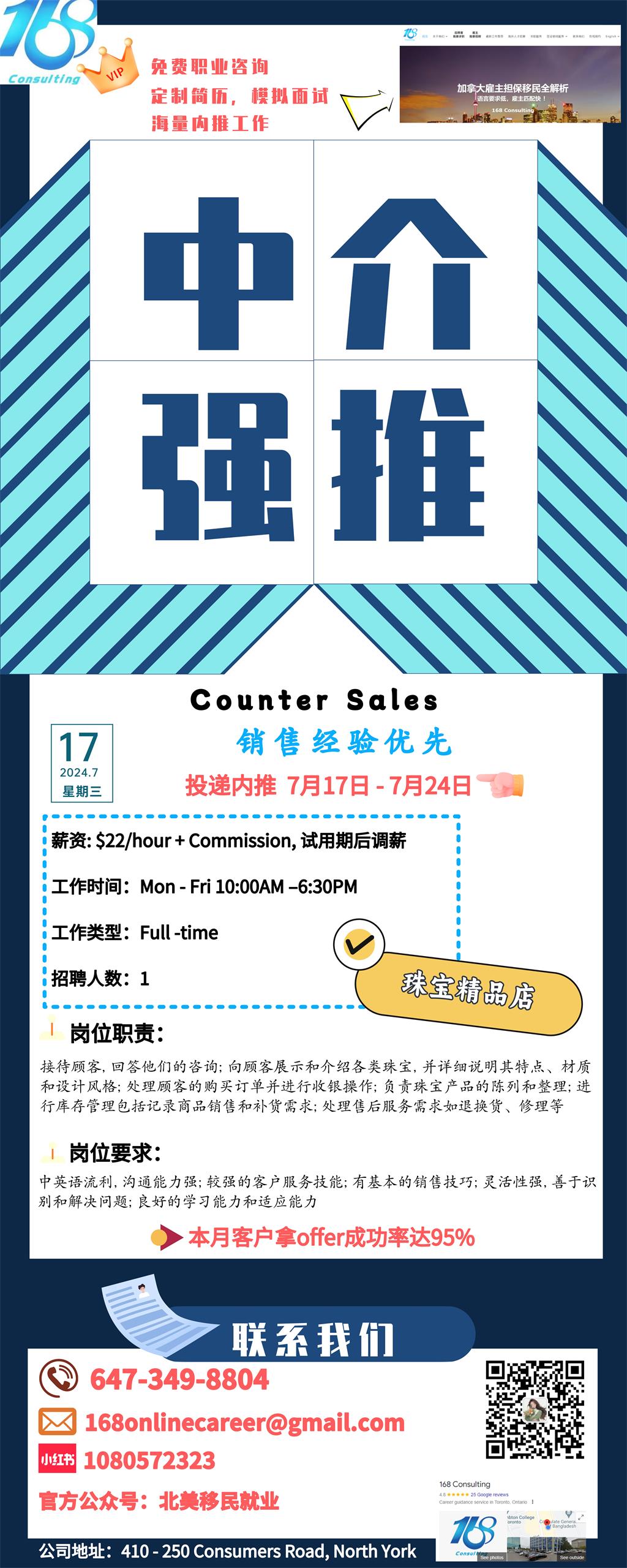 【168新岗】多伦多珠宝精品店请Counter Sales 1名