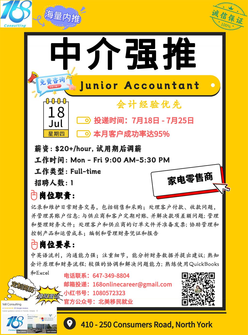 【168新岗】士嘉堡家用电器零售商招聘Junior Accountant 1名