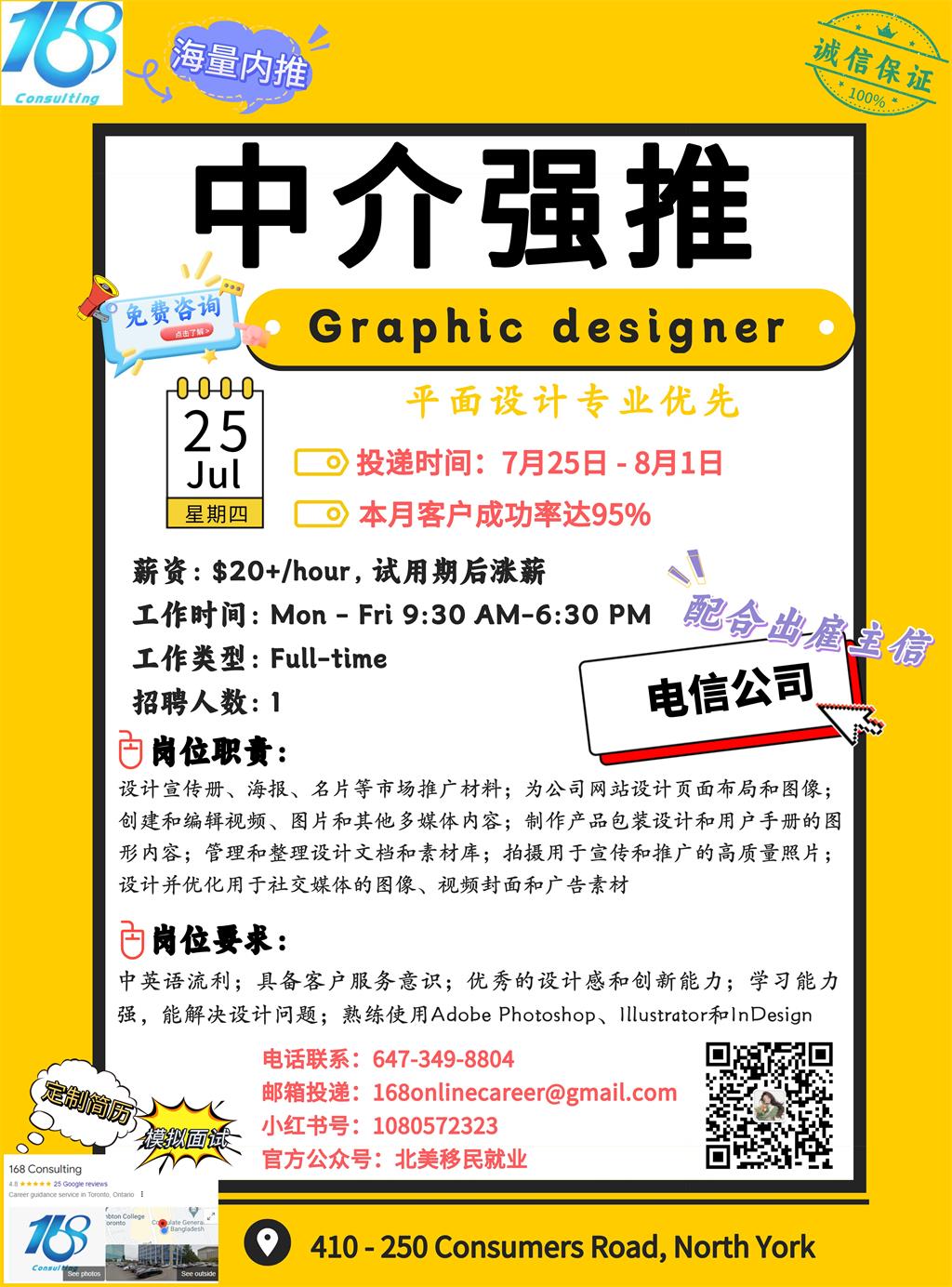 【168新岗】士嘉堡电信公司招聘Graphic designer 1名 (可移民)