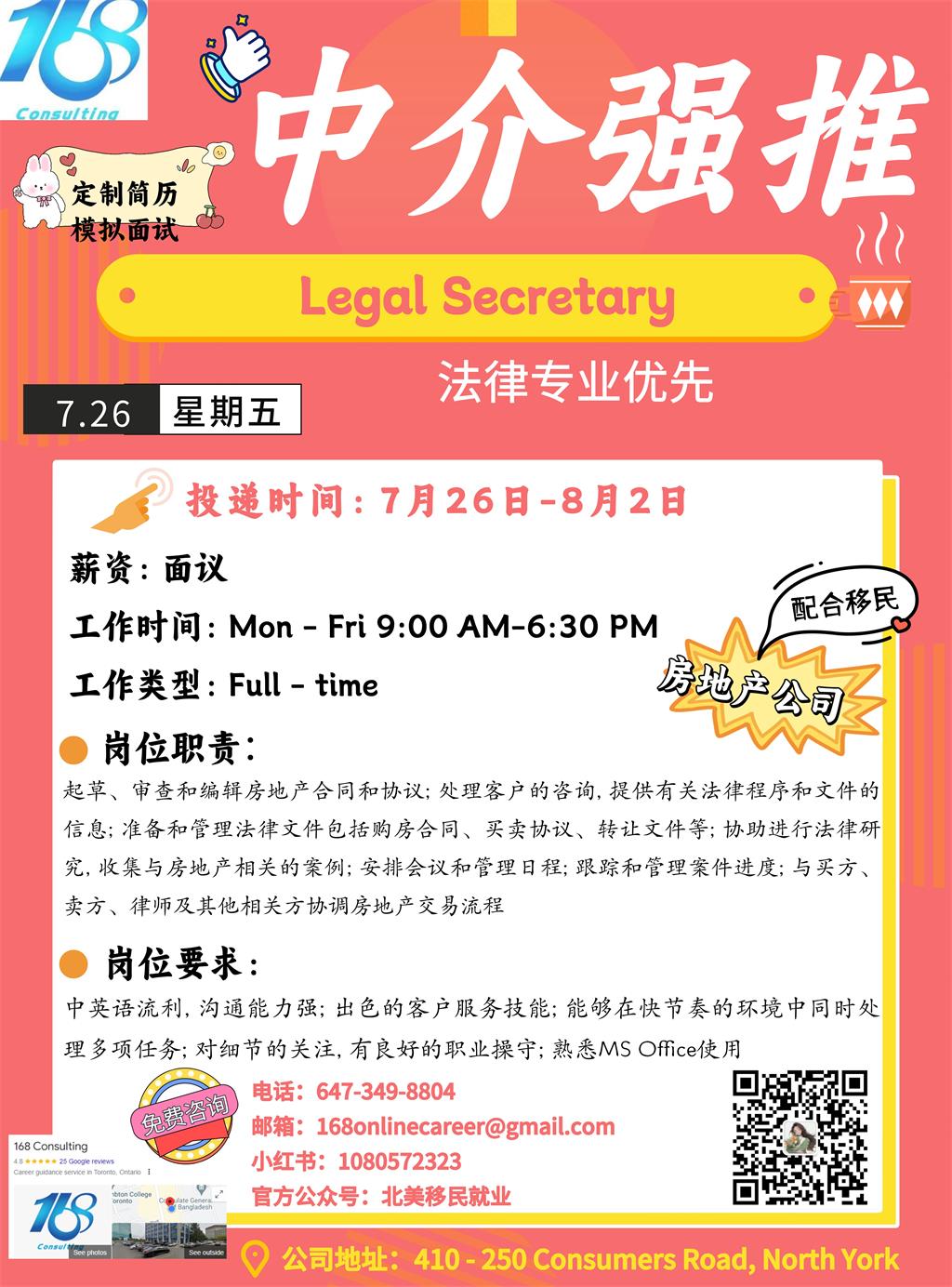 【168新岗】多伦多房地产公司招聘Legal Secretary 1名(可移民)