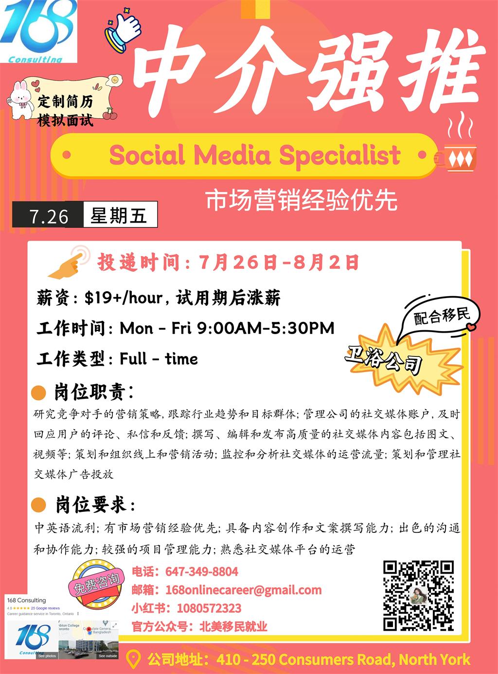 【168新岗】万锦卫浴公司招聘Social Media Specialist 1名(可移民)