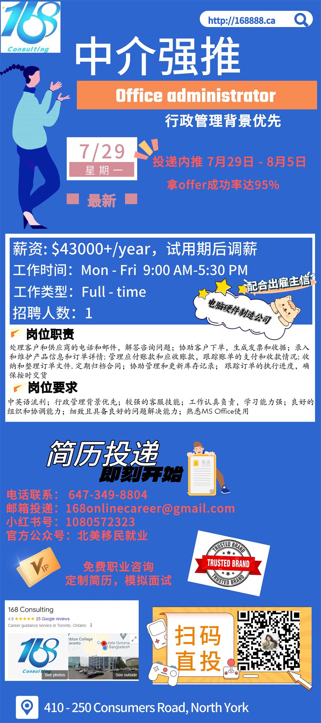 【168新岗】列治文山电脑硬件制造公司招聘Office administrator 1名 (可移民)