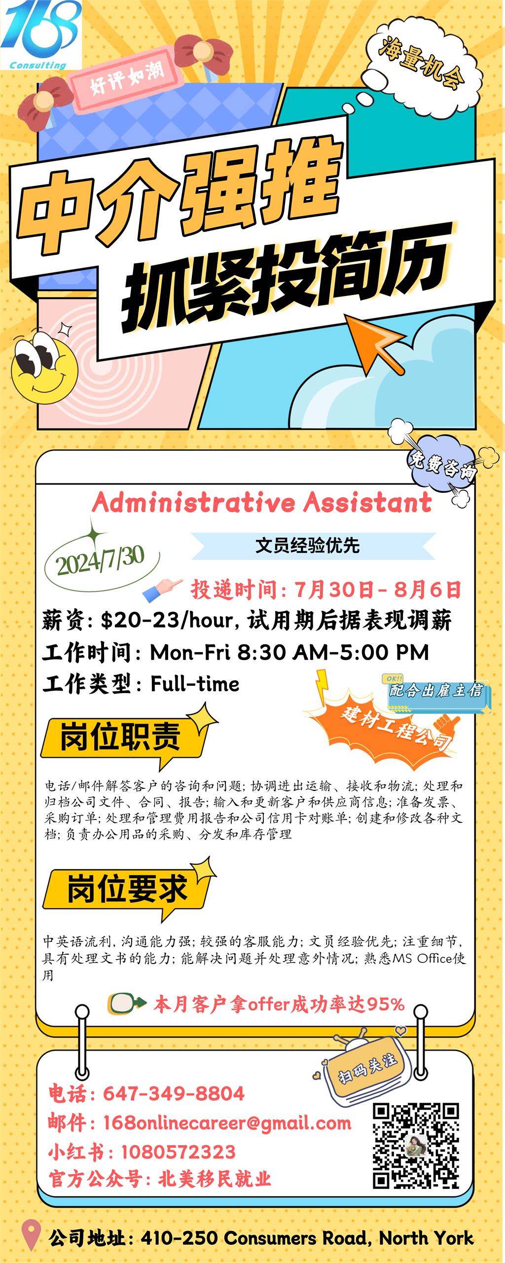 【168新岗】Oakville建材工程公司招聘Administrative Assistant 1名 (可移民)