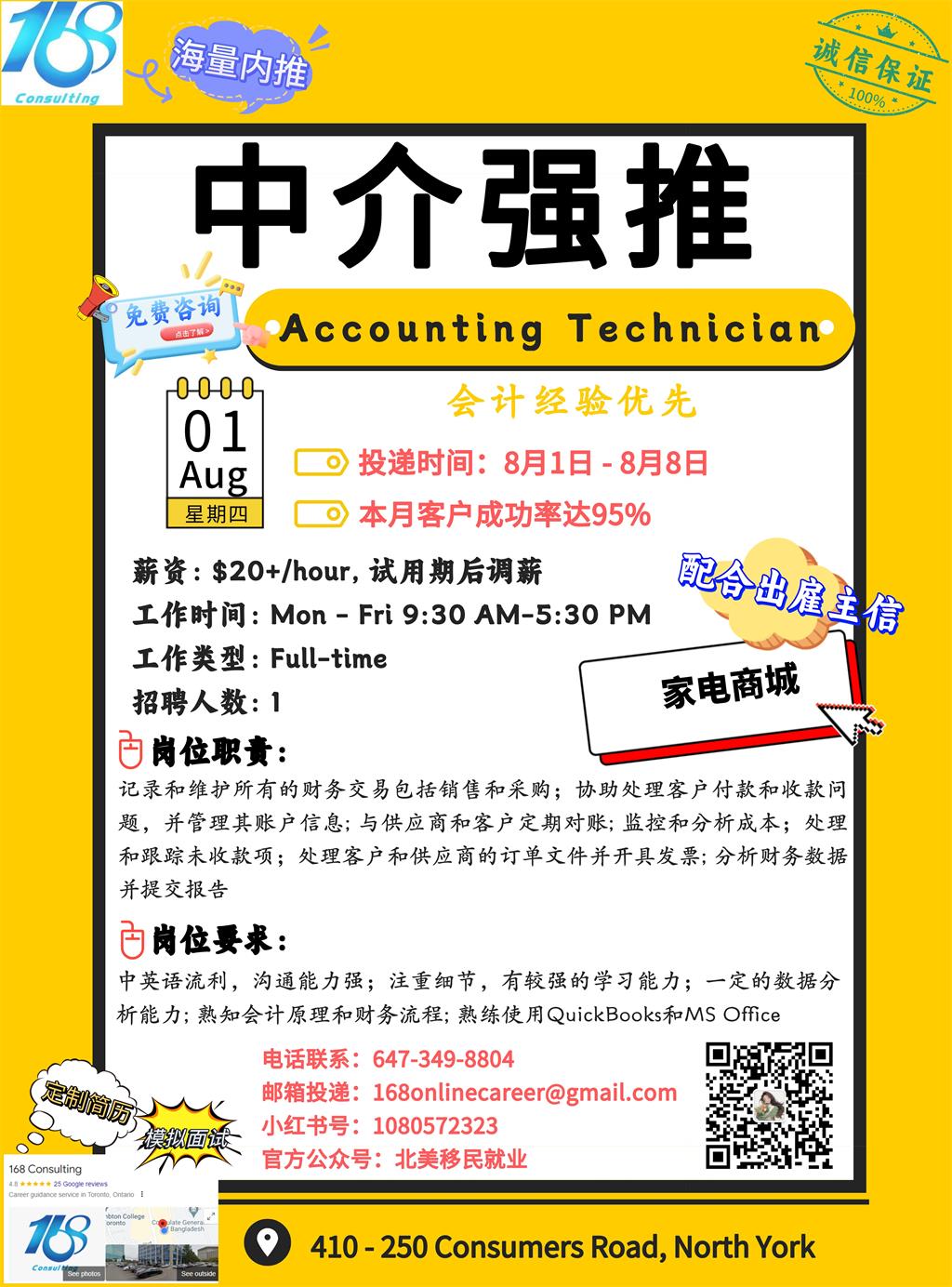 【168新岗】列治文山家电商城招聘Accounting Technician 1名 (可移民)